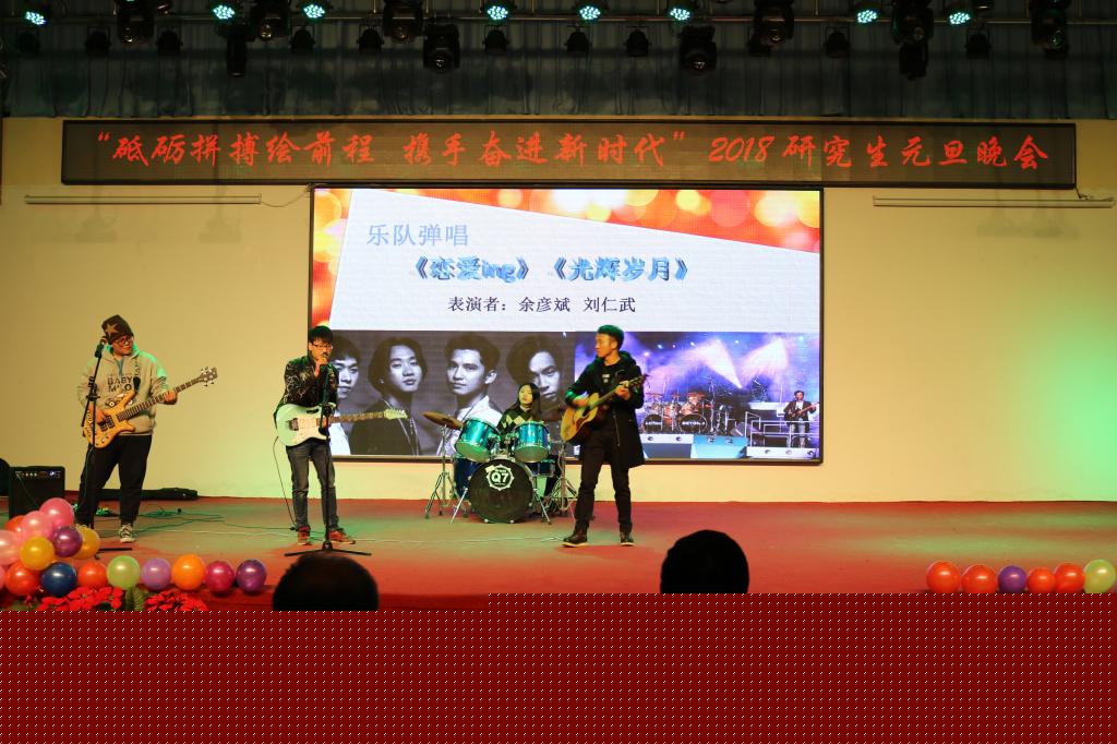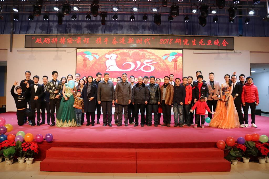 12月26日晚,在大学生活动中心多功能厅,研究生处举办了主题为“砥砺拼搏绘前程,携手奋进新时代”的2018研究生元旦晚会。副校长汪荣有致元旦献词,副校长汪胜前和研究生处处长李沛武、校团委书记宋志刚、水利与生态工程学院院长彭友文、机械与电气工程学院院长黄志开、研究生处党总支副书记陈继宇以及研究生导师代表、研究生处教师等嘉宾出席晚会,全体研究生参加晚会。